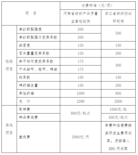 三、 棉纱指定质检机构及检验费用见下表。