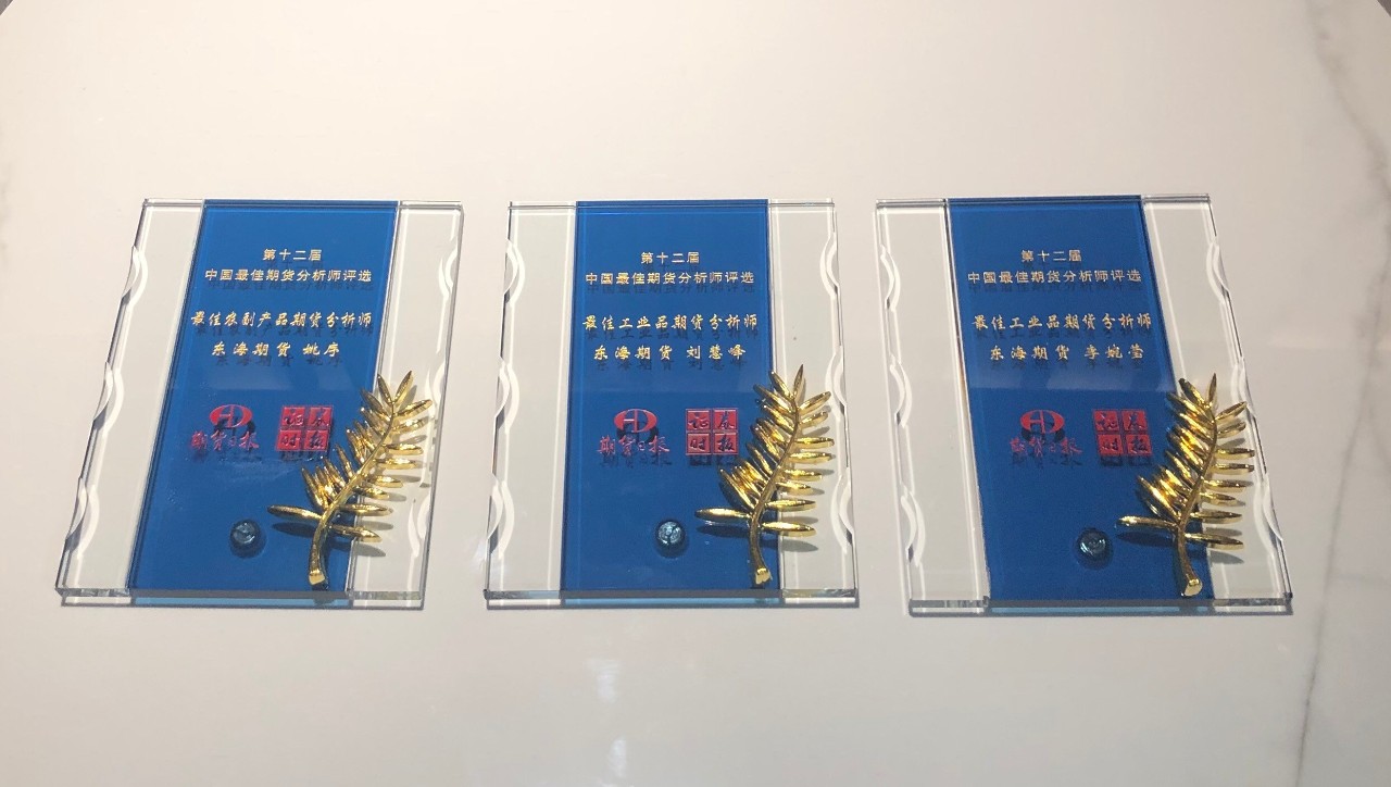 2019年11月22日,东海期货在由期货日报社联合证券时报社共同主办的“2019年中国期货业研究发展论坛暨第十二届中国最佳期货分析师评选”颁奖典礼上荣获中国最佳期货公司、最佳诚信自律期货公司、最佳商品期货产业服务奖、最佳金融期货服务奖、最佳精准扶贫突出贡献奖、最佳企业品牌建设奖、中国期货公司金牌管理团队七项大奖,东海期货总经理陈太康先生荣获中国期货公司年度最佳掌舵人,东海期货上海分公司、杭州营业部获得最佳中国期货经营分支机构大奖,公司三位高级分析师刘慧峰、李婉莹、姚序分获工业品、农副产品最佳分析师称号。