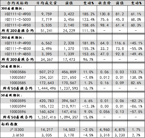 标的指数与行情:上周沪深300指数收于4959.73点,较前值上升0.56%;成交额方面上周累计成交14293亿元,日均成交2859亿元,较前值下降31亿元。两市融资融券余额为17047亿元,北向资金当周净流入233亿元。涨幅前五的行业分别是化工(3.39%)、家用电器(3.30%)、电气设备(2.42%)、非银金融(2.18%)、农林牧渔(1.71%);涨幅后五的行业分别是综合(-1.38%)、钢铁(-1.67%)、采掘(-2.08%)、休闲服务(-2.14%)、通信(-2.34%)。
