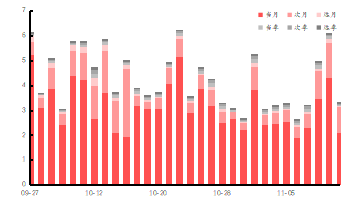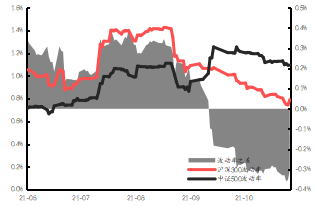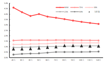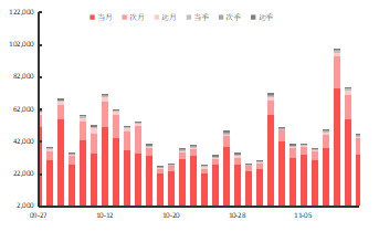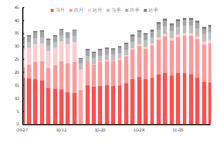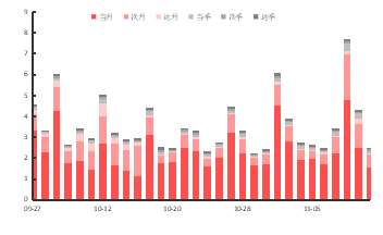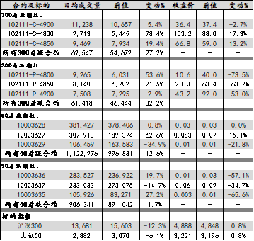 期权行情:本周看涨期权合约日均成交量略有上涨。近月平值看涨期权隐含波动率为15.39%,较前值下降0.82%;看跌期权隐含波动率为15.27%,较前值下降1.47%。