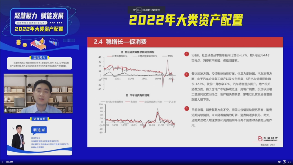 东海期货有限公司首席宏观研究员明道雨为大家带来《2022年大类资产配置》主题演讲,他首先讲解了2022年全球宏观经济形势,指出俄乌冲突导致能源和食品价格持续上涨,进一步加剧了全球通胀压力;为抑制通胀,美联储大概率继续维持紧缩货币政策;全球经济增速将进一步放缓,进入类衰退阶段。随后解读了当前的国内经济形势,指出下半年在国内基建、房地产以及促消费等稳增长政策刺激下,国内经济在疫情冲击下二季度触底后将率先进入复苏阶段;但是由于海外经济增长放缓以及国内进入去库存阶段,整体复苏动能较弱。最后,明道雨结合国内外经济背景,深入分析了股市、债市、商品、汇率等大类资产配置价值的行情走势,助力上市公司借助资本市场力量实现大类资产优化配置。