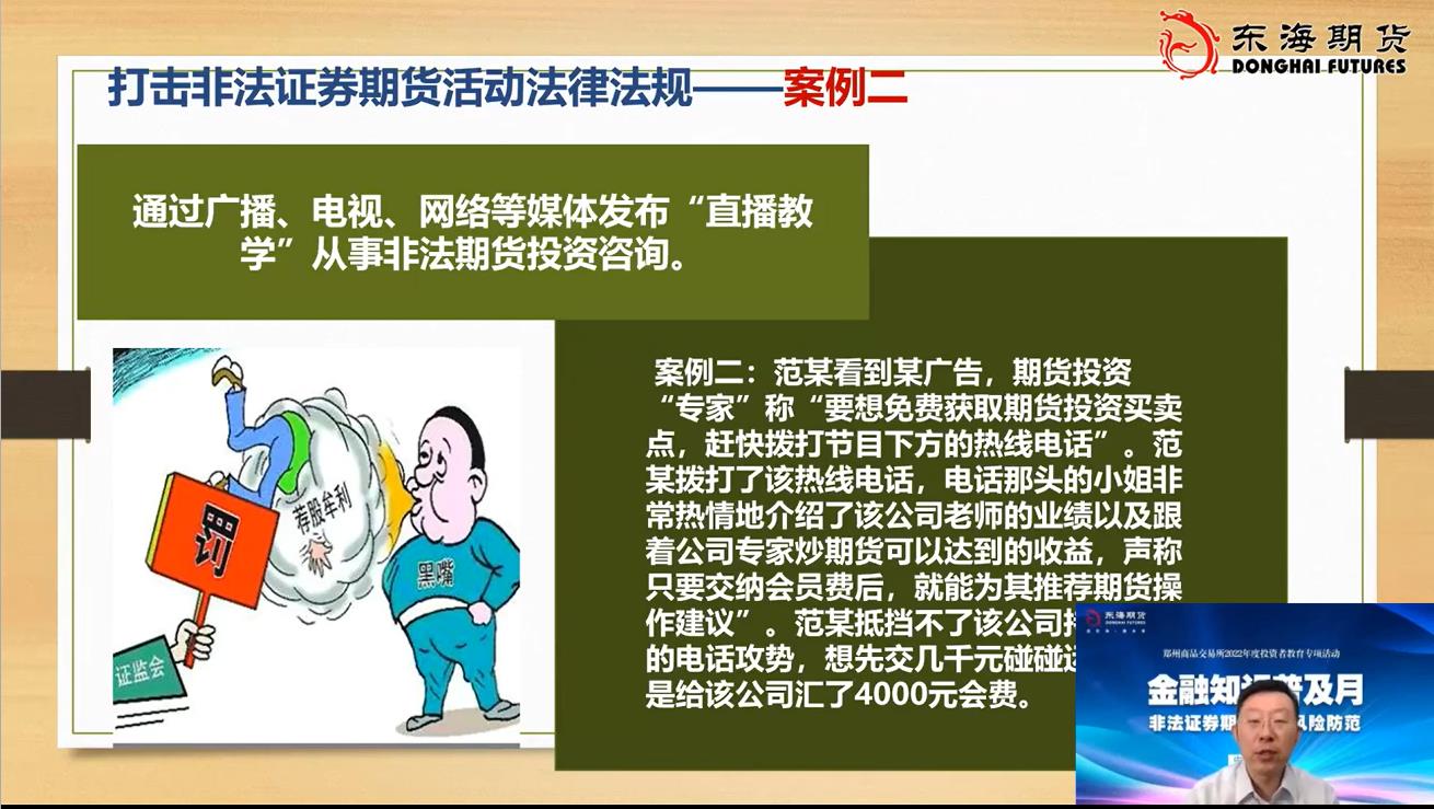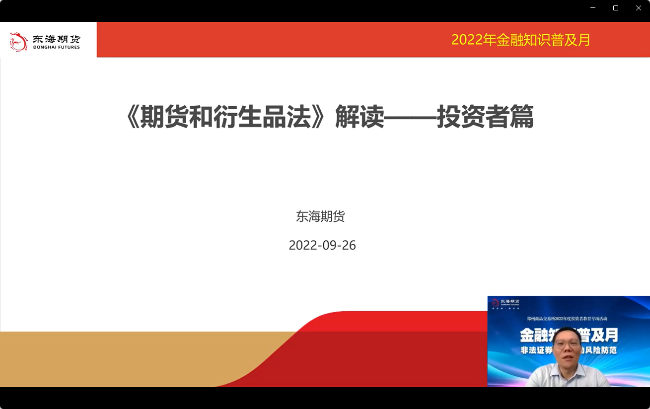 2022年9月26日下午3时许,东海期货有限责任公司通过小鹅通直播平台向投资者开办了一堂生动的金融知识讲座课堂。本次金融知识讲座得到了郑州商品交易所的大力支持,也是东海期货开展金融知识普及月系列宣传活动的重要内容之一。此次金融知识讲座课堂邀请东海期货首席风险官林帅先生及互联网金融部副总经理宋鹏先生作为嘉宾,分别为大家讲解《期货和衍生品法》解读——投资者篇及非法证券期货活动风险防范案例。