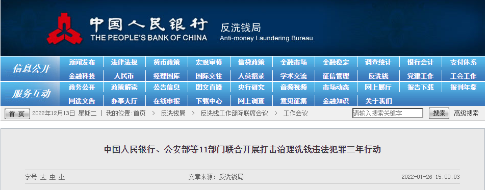 为打击治理洗钱违法犯罪活动,进一步健全洗钱违法犯罪风险防控体系,2022年,中国人民银行、公安部、国家监察委员会、最高人民法院、最高人民检察院、国家安全部、海关总署、国家税务总局、银保监会、证监会、国家外汇管理局联合印发了《打击治理洗钱违法犯罪三年行动计划(2022—2024年)》,决定于2022年1月至2024年12月在全国范围内开展打击治理洗钱违法犯罪三年行动。