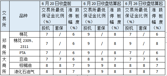 1、自2023年6月20日结算时起,棉花、PTA期货合约的交易保证金标准调整为9%,涨跌停板幅度调整为8%。