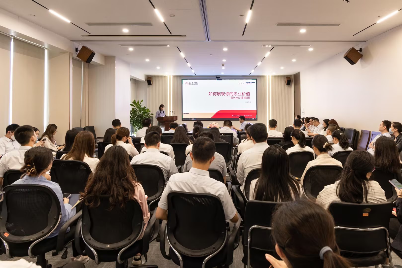 为进一步强化员工培训,搭建多维度人才培训体系,促进员工技能素质提升,赋能员工与企业共同发展成长,东海期货培训学院开设“海之声”大讲堂,并于2023年9月19日在上海总部正式开讲。第一期公开课由公司首席风险官林帅为全体员工带来了“如何展现你的职业价值——职业价值感悟”主题演讲。