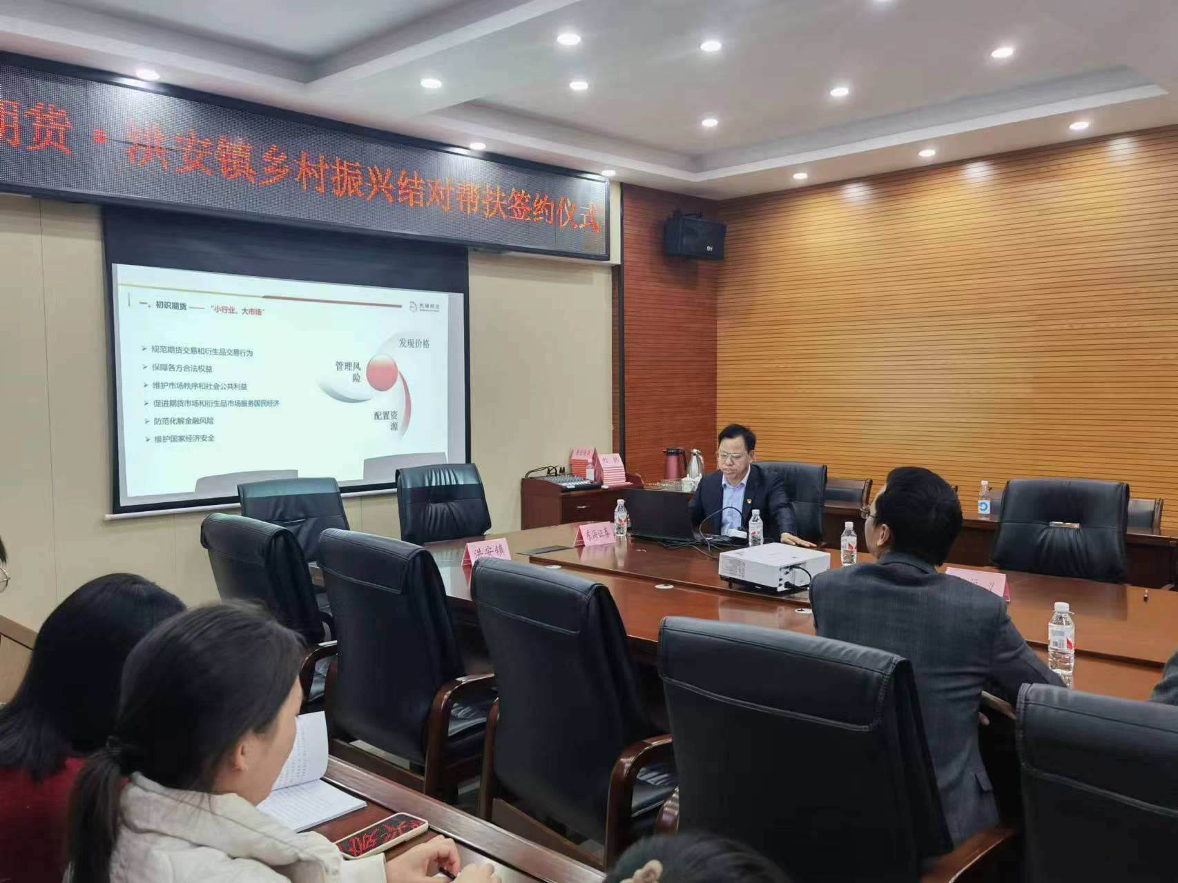当天上午,东海期货党建引领乡村振兴领导小组副组长、上海第二党支部委员刘福义为洪安镇相关领导作了一场专题报告,内容涵盖金融知识及行业政策。在报告中,刘福义同志首先对期货行业进行了深入介绍,并着重强调了期货金融行业服务实体经济的重要内涵,同时就农产品期货这一与当地息息相关的金融知识进行了讲解。这次报告阐释了期货在价格发现、风险管理和资源配置等方面对于支持农村工作的基本路径,解读了“保险+期货+N”创新业务模式所带来的积极效果,并强调了金融创新在服务“三农”、支持乡村振兴战略中的重要地位,对于加强基层党建共建和赋能当地乡村振兴具有重要意义。刘福义表示,东海期货将充分发挥自身金融平台资源优势,帮助秀山县洪安镇引进新兴金融业态,以支持乡村振兴建设。
