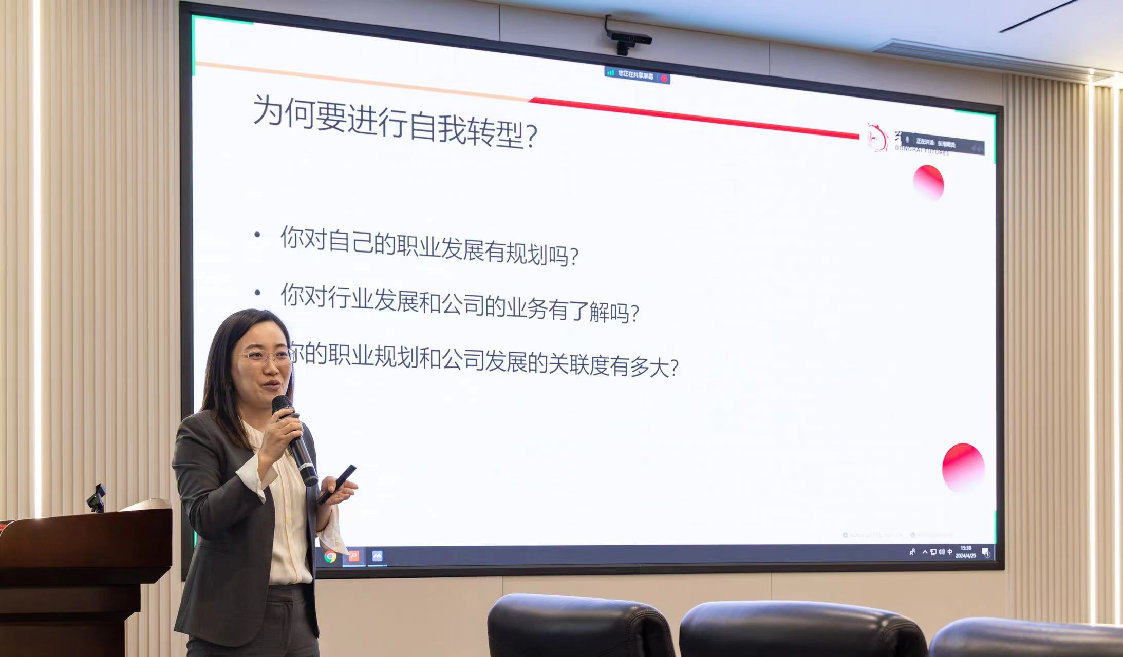 刘洋洋的分享以“为何要进行自我转型?”这一问题为引子,从自身的职业发展经历出发,为东海期货员工分享了自我认知、目标设定、工作心态以及沟通技巧四个方面的关键要素。
