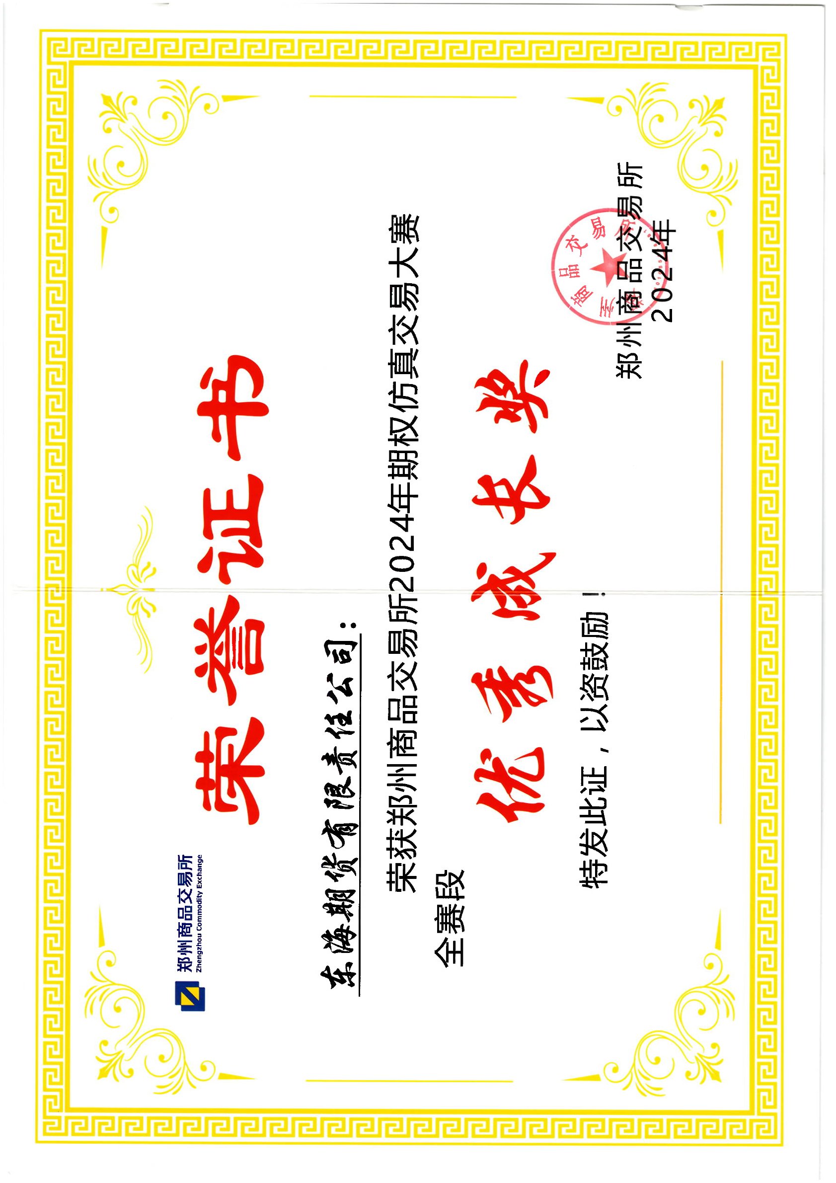 2024年12月,郑商所2024年期权仿真交易大赛获奖名单正式公布,东海期货荣获全赛段“优秀成长奖”。