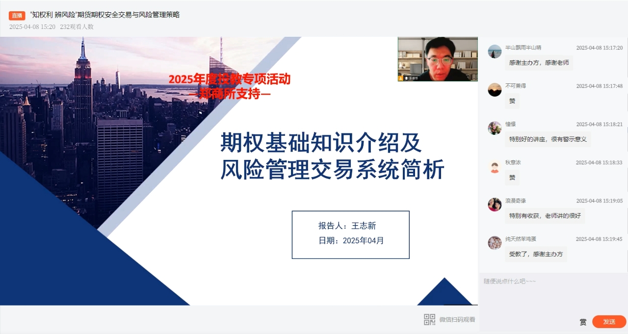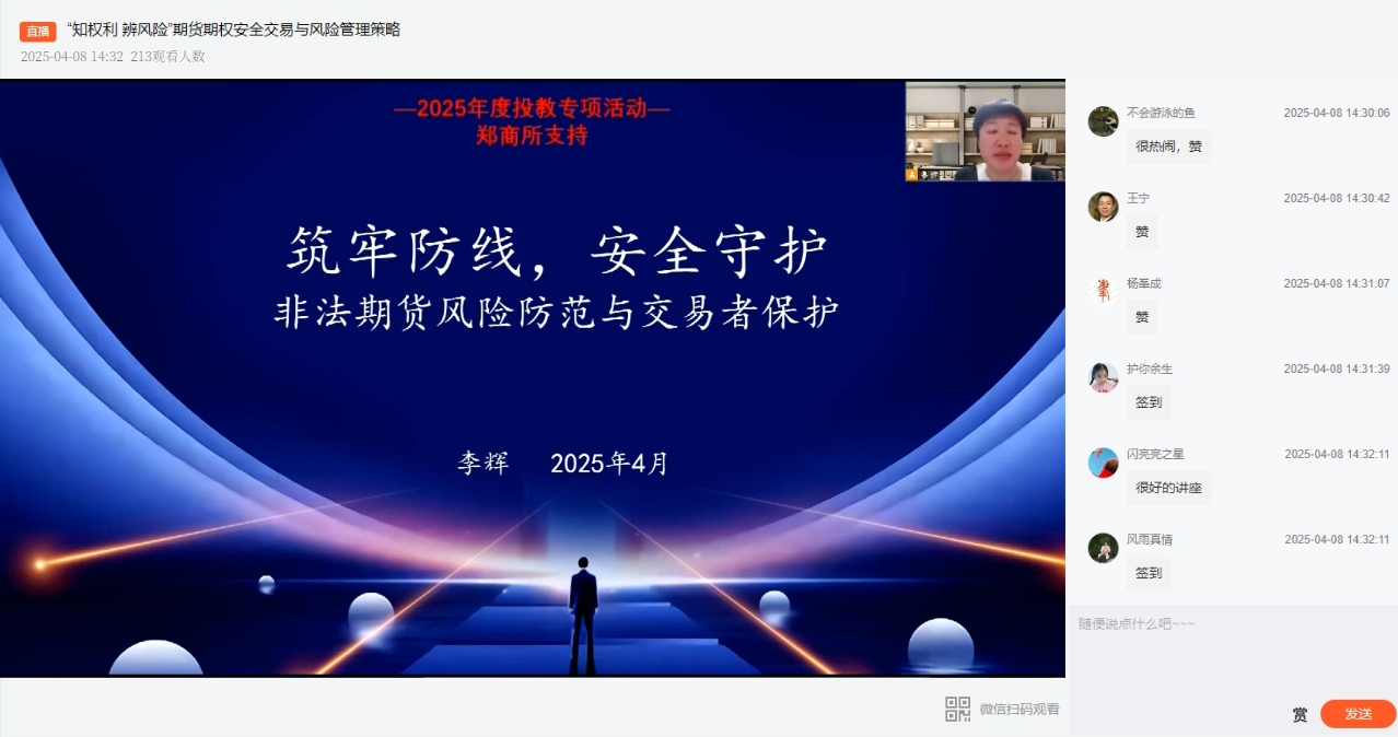 2025年4月8日,在郑州商品交易所支持下,东海期货青岛分公司成功举办“‘知权利辨风险’期货期权安全交易与风险管理策略”线上投教活动。活动围绕“非法期货风险防范与交易者保护”以及“期权基础知识介绍及风险管理交易系统简析”两个议题展开,吸引了众多交易者参加。