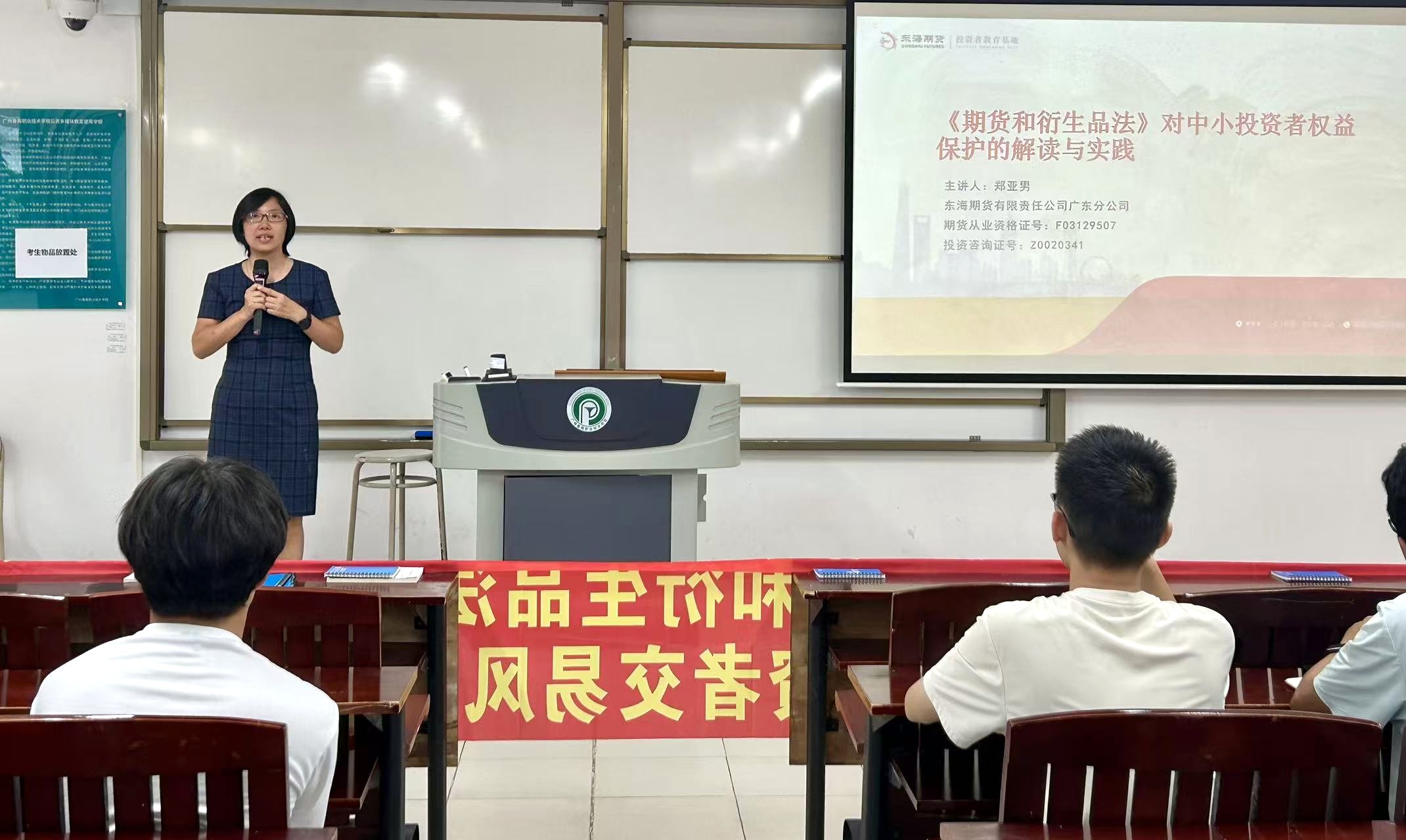 2025年9月18日,在大连商品交易所、江苏证监局支持下,由东海期货主办、广州职业技术大学协办的“DCE·中小同行——《期货和衍生品法》对中小投资者权益保护的解读与实践及投资者交易风险把控的宣传活动”在广州职业技术大学顺利举办。活动吸引了50余名大一学生积极参与。