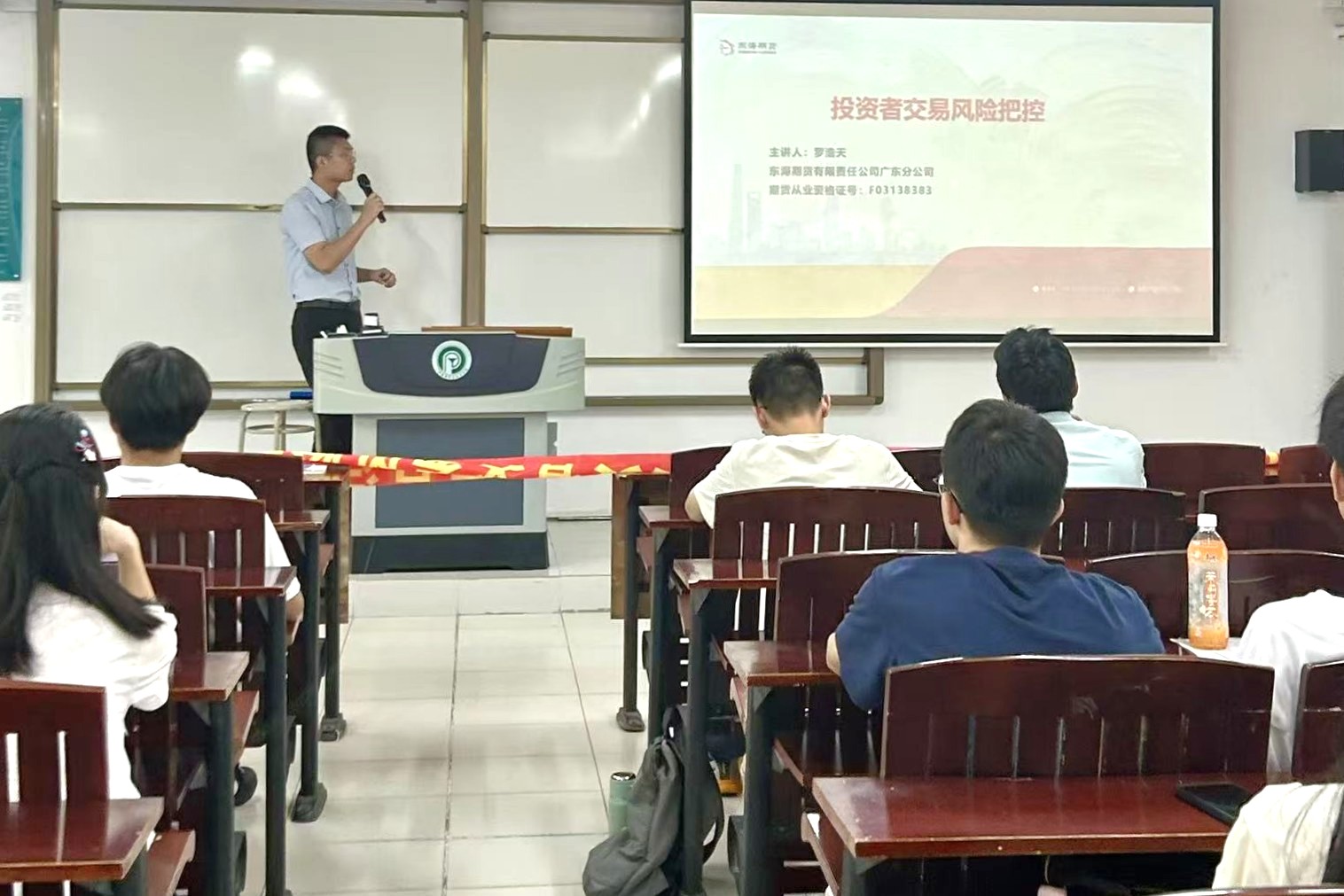 随后,东海期货广东分公司罗浩天以“投资者交易风险的把控”为主题展开分享。他系统介绍了期货市场的基础知识、发展历程、核心功能,并结合实际案例讲解了套期保值等风控工具的应用。演讲内容全面覆盖交易风险类型、风险控制方法以及投资者能力建设,旨在帮助投资者理性参与市场,提升风险防范能力。