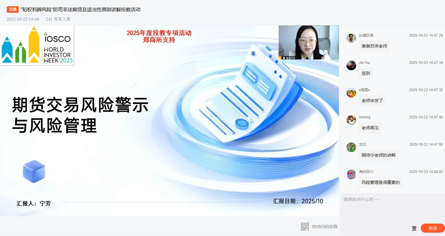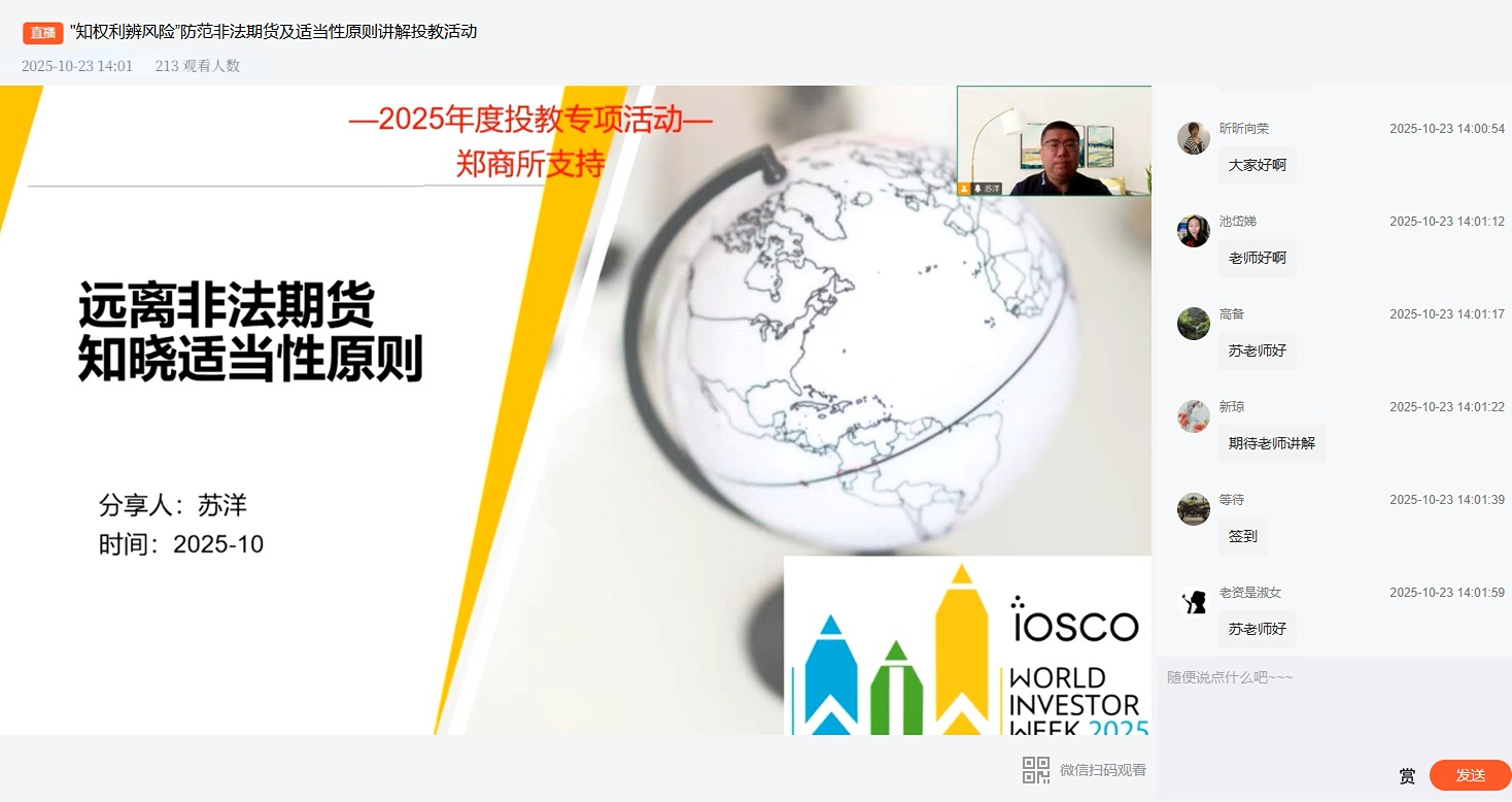 2025年10月23日,在郑州商品交易所的支持下,东海期货青岛分公司成功举办“知权利辨风险”防范非法期货及适当性原则讲解投教活动。 活动采用线上直播形式,吸引了200余名交易者参与。