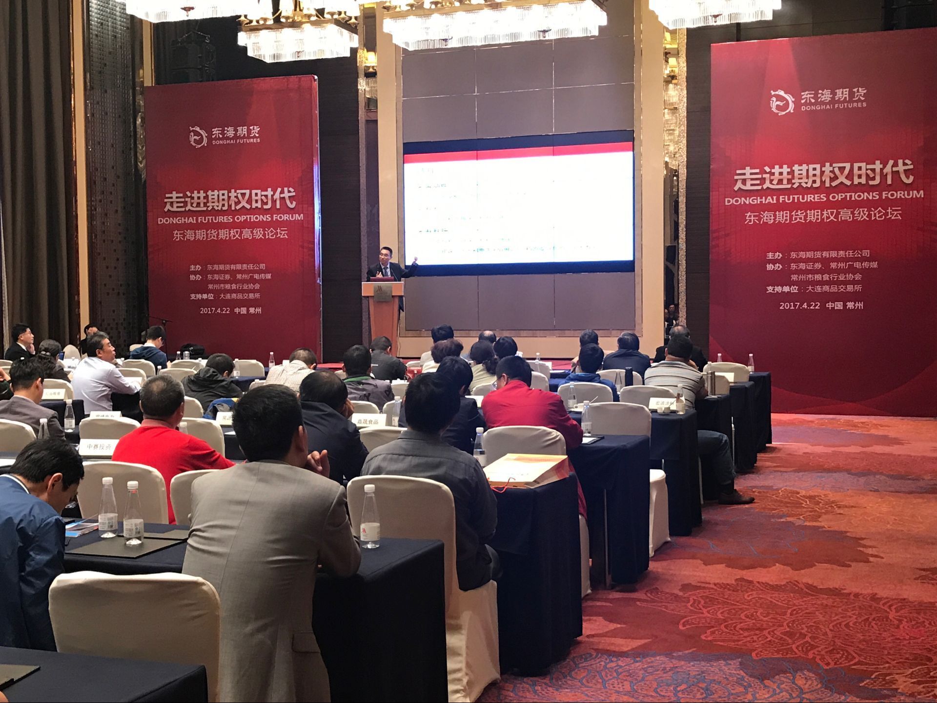 2017年4月22日,由东海期货主办的《走进期权时代》高级论坛会议在常州万豪酒店尊贵厅隆重举行。此次会议得到了大连商品交易所的特别支持,大商所上海发展与服务总部宿红星主任专程与会并致辞。会议邀请了常州地区的部分粮油企业、饲料企业、石化企业、钢铁企业、贸易商、投资公司及个人投资者共100多名,会场座无虚席。