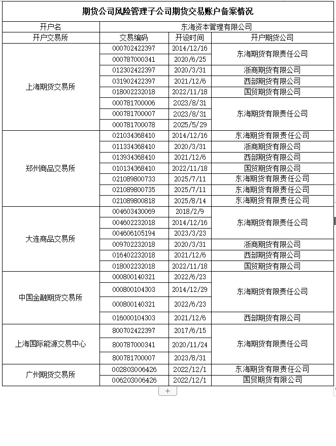 经中国期货业协会(中期协备字〔2014〕10号、〔2016〕27号、〔2018〕28号)文件复函,对东海期货有限责任公司设立子公司开展以风险管理服务为主的业务试点予以备案。现按照《期货公司风险管理公司业务试点指引》第四十九条的要求,将子公司有关信息公示如下: