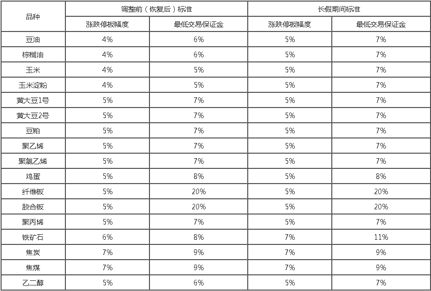 自2018年12月27日(星期四)结算时起,将铁矿石品种涨跌停板幅度和最低交易保证金标准分别调整至7%和11%;将豆油、棕榈油、玉米、玉米淀粉、乙二醇品种涨跌停板幅度和最低交易保证金标准分别调整至5%和7%;黄大豆1号、黄大豆2号、豆粕、聚乙烯、聚丙烯、聚氯乙烯、鸡蛋、焦煤、焦炭、胶合板和纤维板品种涨跌停板幅度和最低交易保证金标准维持不变。