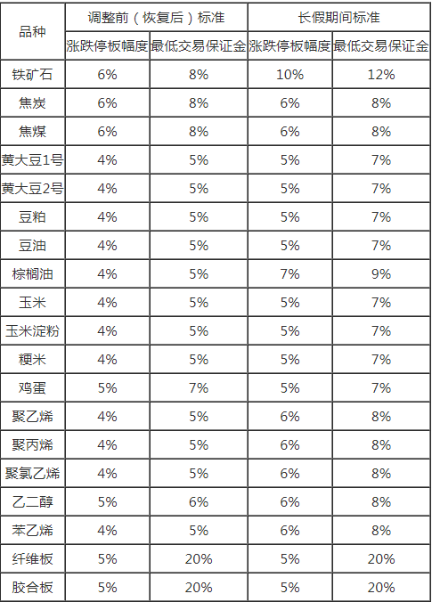 2019年10月8日(星期二)恢复交易后,自各品种持仓量最大的两个合约未同时出现涨跌停板单边无连续报价的第一个交易日结算时起,各品种涨跌停板幅度和最低交易保证金标准分别恢复至调整前的标准,即:铁矿石品种涨跌停板幅度和最低交易保证金标准分别恢复至6%和8%;黄大豆1号、黄大豆2号、豆粕、豆油、棕榈油、玉米、玉米淀粉、粳米、聚乙烯、聚丙烯、聚氯乙烯和苯乙烯品种的涨跌停板幅度和最低交易保证金标准分别恢复至4%和5%;乙二醇品种的涨跌停板幅度和最低交易保证金标准分别恢复至5%和6%;焦炭、焦煤、鸡蛋、纤维板和胶合板品种的涨跌停板幅度和最低交易保证金标准维持不变。