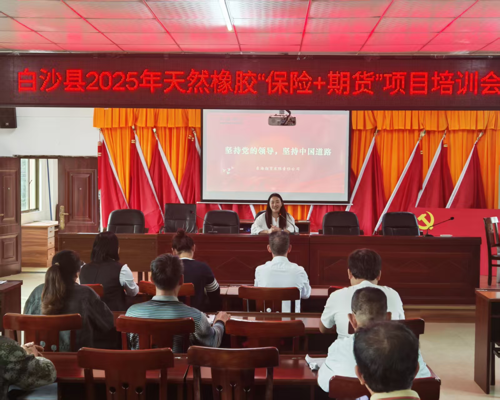 签约仪式后,刘洋洋以“坚持党的领导,坚持中国道路”为主题,为在场党员代表讲授专题党课。她结合中央金融工作会议精神,强调期货公司要坚守服务实体经济根本宗旨,把促进橡胶等特色农业产业发展作为服务国家战略的重要抓手。党课紧密联系“期货+保险”的实践案例,引导基层党员将党的创新理论转化为守护胶农利益、推动产业振兴的实际行动。