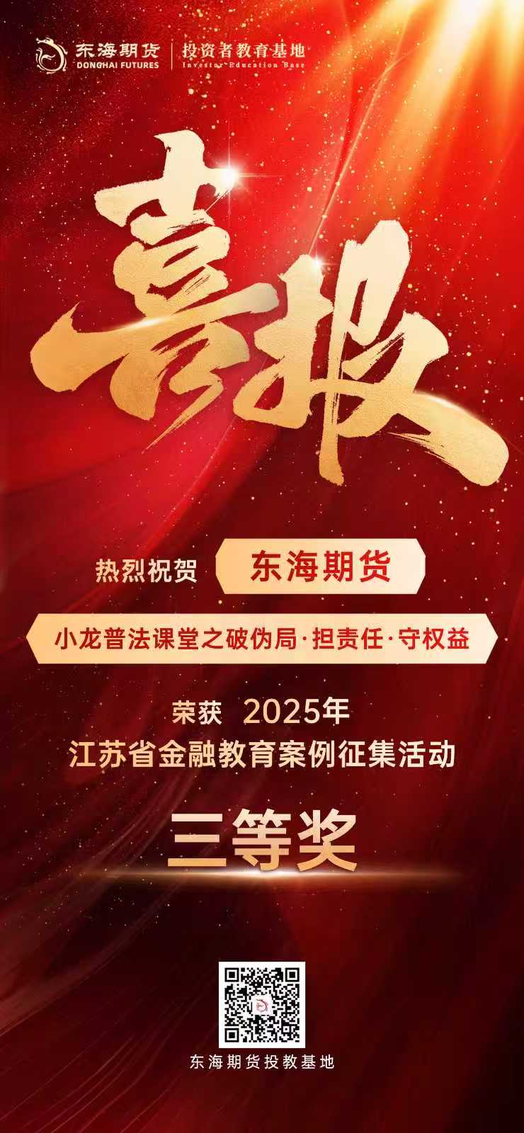 近日,“2025年江苏省优秀金融教育案例征集活动”评选结果正式揭晓。东海期货有限责任公司报送的《小龙普法课堂之破伪局·担责任·守权益》系列防非宣传视频,凭借专业的制作水准和扎实的教育内涵,在众多参评案例中获得评审专家的一致认可,荣获大赛三等奖。东海期货也成为本次活动中三家获奖的期货公司之一。