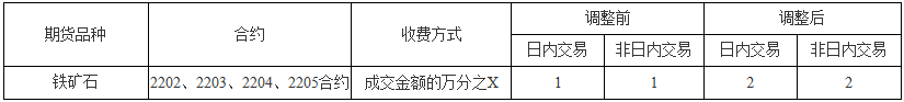 经研究决定,自2月16日(即2月15日夜盘交易小节)起,对铁矿石期货2202、2203、2204和2205合约手续费费率进行调整,具体如下: