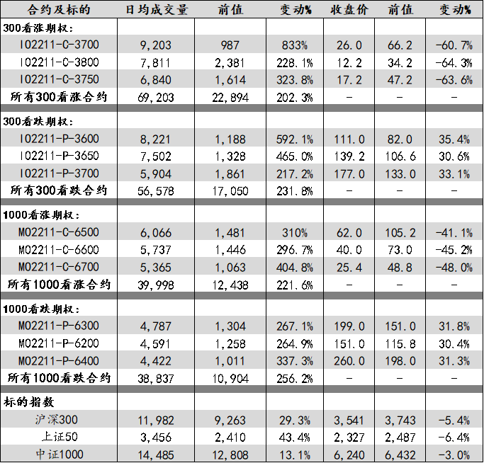 标的指数与行情:上周沪深300指数收于3541.33点,较前值下跌5.39%;累计成交12245亿元,日均成交2449亿元,较前值增加492亿元;中证1000指数收于6239.93点,较前值下跌2.99%;累计成交9393亿元,日均成交1879亿元,较前值增加204亿元。两市融资融券余额为14526亿元,北向资金当周净流出127亿元。涨幅前五的行业分别是国防军工(2.65%)、计算机(1.42%)、电子(-1.83%)、有色金属(-2.15%)、机械(-2.40%);涨幅后五的行业分别是综合(-5.86%)、电力及公用事业(-5.92%)、房地产(-7.87%)、农林牧渔(-10.17%)、食品饮料(-12.00%)。